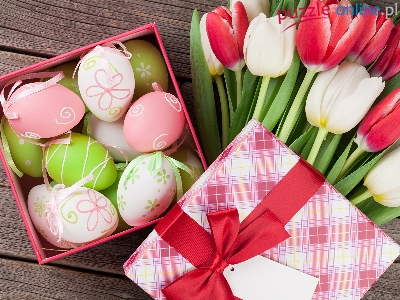 Kolorowe, Pudełko, Zawieszka, Deski, Kokardka, Pisanki, Tulipany