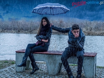 Deszcz, Ławka, Kobieta, Mężczyzna, Parasol