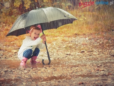 Deszcz, Dziewczynka, Kałuże, Dziecko, Parasol, Kalosze