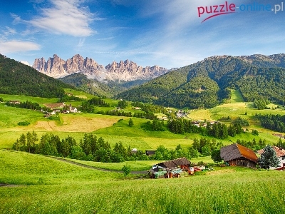 Dolina Val di Funes, Drzewa, Włochy, Wieś Santa Maddalena, Góry Dolomity