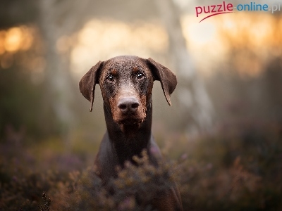 Doberman, Wrzosy, Pies, Mordka, Rozmyte
