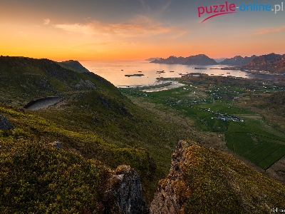 Dolina, Norwegia, Roślinność, Wschód słońca, Góry, Lofoty, Morze Norweskie