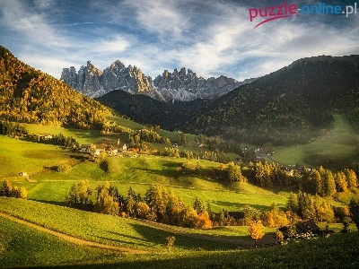 Dolina Val di Funes, Dolomity, Masyw Odle, Lasy, Jesień, Góry, Włochy, Wieś Santa Maddalena, Drzewa