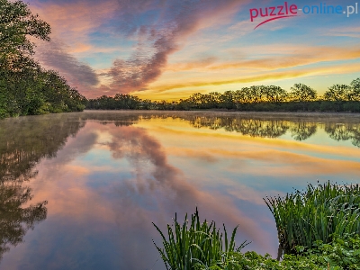 Dolina Wittlicha, Chmury, Wschód słońca, Drzewa, Niemcy, Jezioro Sterenbachsee