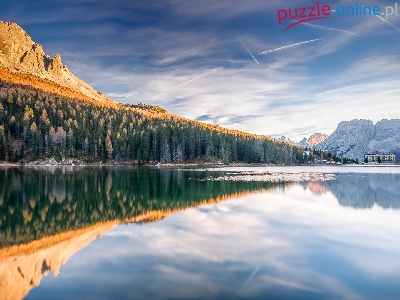 Grand Hotel Misurina, Góry, Cortina dAmpezzo, Włochy, Drzewa, Dolomity, Jezioro, Domy, Las, Misurina Lake