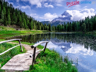 Trawa, Góry, Chmury, Włochy, Antorno Lake, Dolomity, Las, Mostek, Jezioro, Drzewa