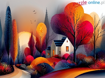 Puzzle Jesień, Dom, Drzewa, Grafika AI