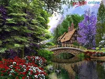 Rzeczka, Dom, Mostek, Malarstwo, Kwiaty