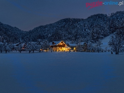 Dom, Lasy, Zima, Góry, Oświetlony, Noc