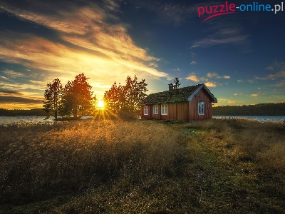 Norwegia, Dom, Drzewa, Zachód Słońca, Ringerike, Jezioro, Trzciny