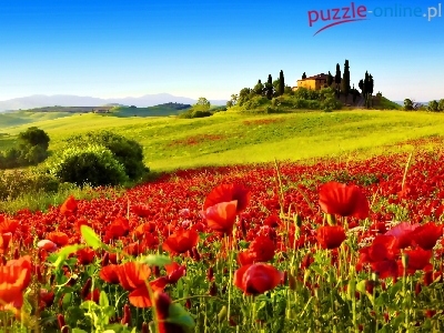 Puzzle Łąki, Wzgórza, Dom, Maki
