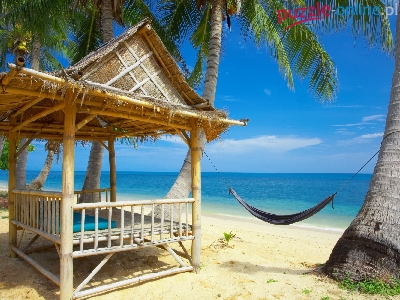 Domek, Palmy, Plaża, Morze, Hamak