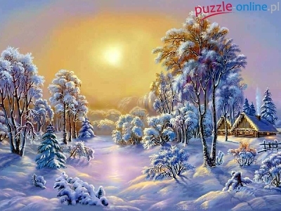 Puzzle Śnieg, Drzewa, Domki, Zima