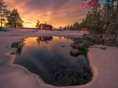 Domki, Zamarznięte, Kamienie, Zima, Jezioro, Drzewa