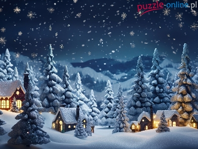 Śnieg, Drzewa, Zima, Domki, Grafika, Światła
