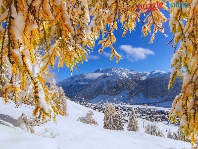 Puzzle Domy, Góry, Drzewa, Śnieg