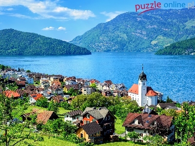 Beckenried, Kościół, Drzewa, Jezioro Czterech Kantonów, Szwajcaria, Góry, Domy