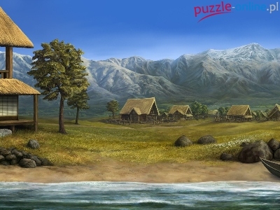 Puzzle Łąka, Góry, Domy, Woda
