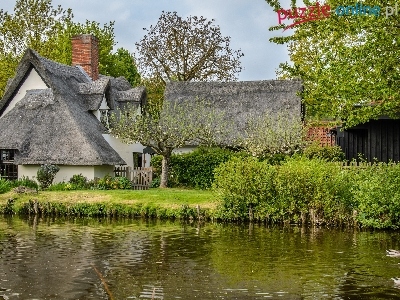 Puzzle Domy, Rzeka, Kaczki, Krzewy