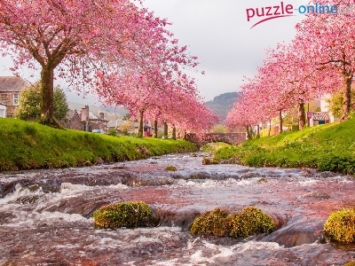 Domy, Drzewa, Rzeka, Kamienie, KwitnÄ…ce