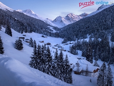 Góry Alpy, Domy, Lasy, Kanton Gryzonia, Zima, Szwajcaria, Miasto Davos, Drzewa