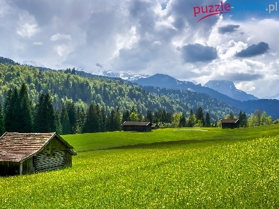 Domy, Chmury, Góry, Las, Łąka