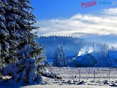 Domy, Poranek, Zima, Las, Wieś