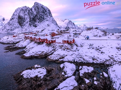 Hamnoy, Norwegia, Lofoty, Domy, Góry, Morze, Zima