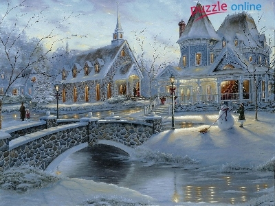 Puzzle Domy, Zima, Śnieg, Rzeka