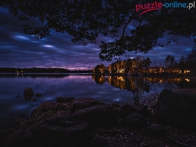 Światła, Noc, Jezioro, Domy, Drzewo