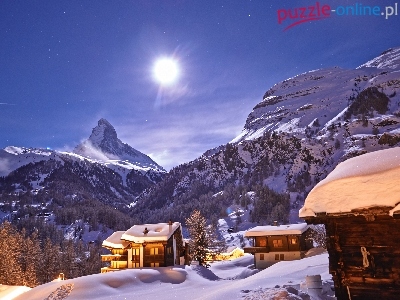 Puzzle Domy, Góry, Zima, Promienie słońca
