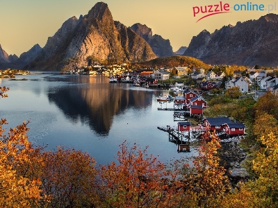 Domy, Drzewa, Jesień, Lofoty, Morze, Ioska Reine, Norwegia, Góry