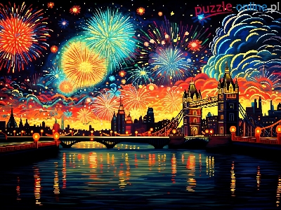 Grafika, Nowy Rok, Londyn, Anglia, Kolorowe, Domy, Rzeka, Fajerwerki, Oświetlenie, Most