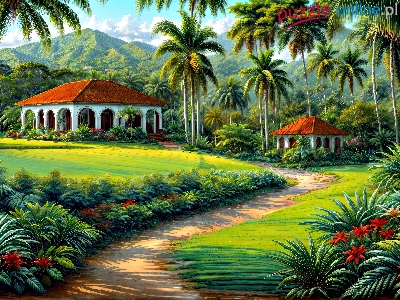 Palmy, Domy, Ścieżka, Grafika, Tropiki