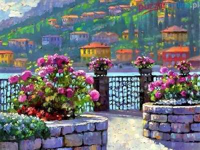 Puzzle Domy, Taras, Wybrzeże, Kwiaty