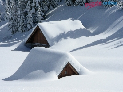 Puzzle Domy, Zima, Zasypane, Drzewa