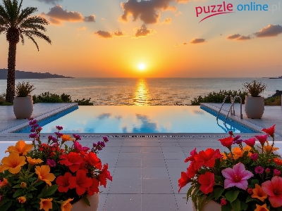 Donice, Leżaki, Kwiaty, Zachód słońca, Basen, Kolorowe, Morze, Palma