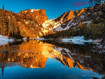 Jezioro, Kolorado, Stany Zjednoczone, Park Narodowy Gór Skalistych, Dream Lake, Odbicie, Jesień, Góry, Lasy