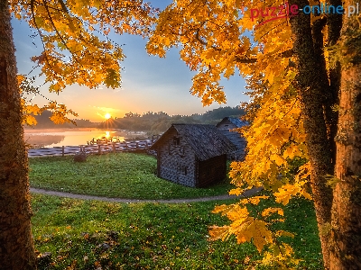 Staw, Jesień, Niebo, Poranek, Liście, Domki, Ogrodzenie, Ścieżka, Drzewa, Drewniane, Wschód słońca