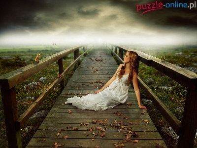 Drewniany, Smutna, Mgła, Zamyślona, Kobieta, Deptak