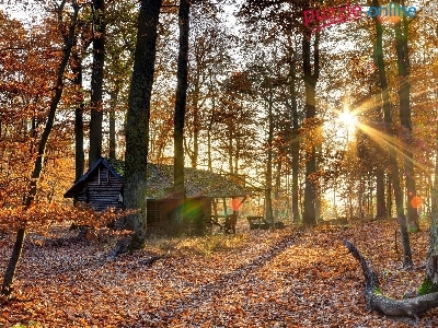 Drewniany, Słońce, Drzewa, Liście, Dom