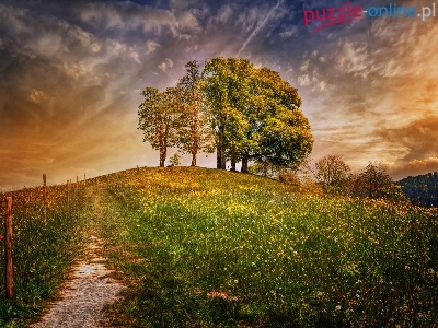 Łąka, Drzewa, Wzgórze, Droga, Chmury