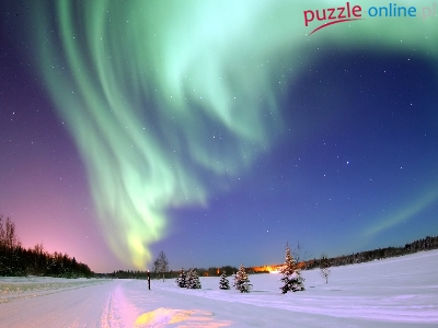 Droga, Polarna, Drzewa, Zorza, Gwiazdy, Śnieg