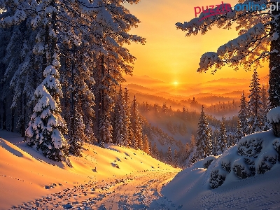Zima, Drzewa, Las, Droga, Góry, Zachód słońca