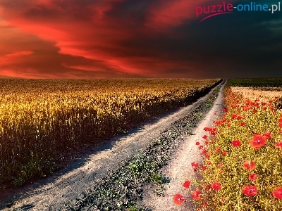 Puzzle Droga, Zachód słońca, Pola, Maki