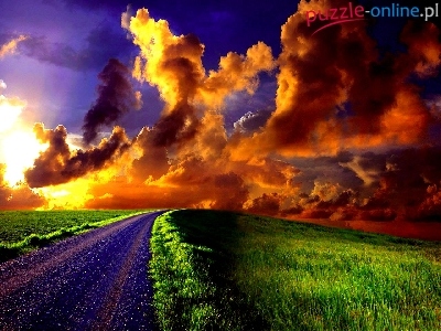 Droga, Trawa, Zachód, Słońca, Chmury