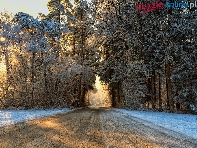 Droga, Drzewa, Zima, Przebijające światło, Las