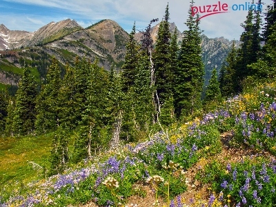 Puzzle Drzewa, Kwiaty, Łąka, Góry