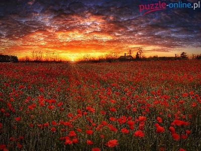 Meklemburgia-Pomorze Przednie, Chmury, Łąka, Zachód słońca, Niemcy, Maki, Drzewa