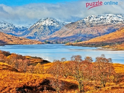 Drzewa, Góry, Jesień, Jezioro, Łąki, Szkocja